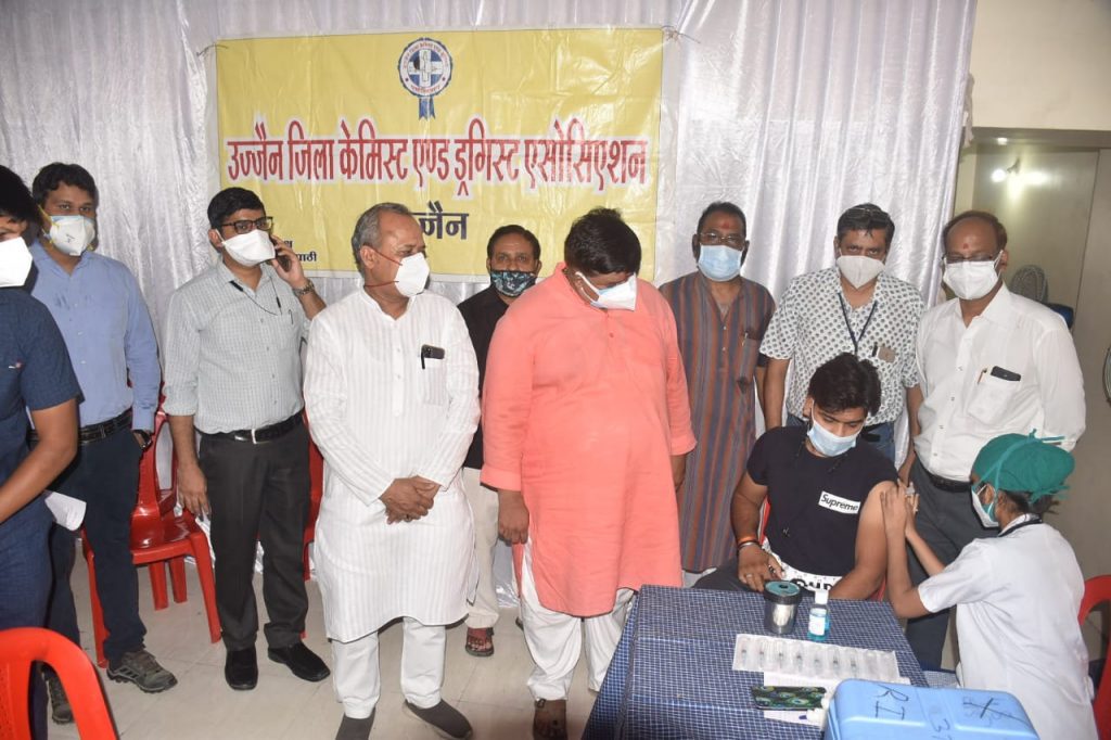 उज्जैन ।(स्वदेश mp न्यूज़… राजेश सिंह भदौरिया बंटी) माधव क्लब रोड़ स्थित दवा बाजार पर शुक्रवार को दवा व्यवसायियों एवं दवा दुकानों पर सेवा देने वाले सहयोगियों के लिए वैक्सीनेशन शिविर आयोजित किया गया।