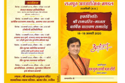 उज्जैन,(स्वदेश mp न्यूज़… राजेश सिंह भदौरिया बंटी) राजपूत आध्यात्मिक मण्डल उज्जयिनी म.प्र. द्वारा 21वें श्रीरामचरित मानस वार्षिक पारायण समारोह 18-19 जनवरी को श्री मायापति हनुमान मंदिर, सामाजिक न्याय परिसर में आयोजित किया जा रहा है। मण्डल के वरिष्ठ संचालक सदस्य अंगदसिंह भदौरिया ने प्रेसवार्ता…